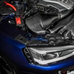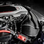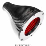 Leistungssteigerung: 13-17PS, 15-20ft-lbV-Box Beschleunigung: 60-130mph reduziert um 0,5 SekundenDas Audi B9 RS4/RS5 Eventuri Ansaugsystem wurde entwickelt, um dem Turbo einen weniger restriktiven Luftstrom zu geben und gleichzeitig niedrige Einlasstemperaturen zu gewährleisten. Der RS5/RS4-Motorraum ist sehr anfällig für Hitzestau, so dass die einfache Verwendung eines offenen Filter-Systems zu einem besseren Luftstrom bei höheren Eintrittstemperaturen führen würde. Deshalb haben wir den Luftstrom vom Turbo-Einlass bis zum Frontgrill mit einem hocheffizienten, abgedichteten System komplett überarbeitet. Die serienmäßig restriktive Airbox und das flexible Kunststoffeinlassrohr wurden durch unser patentiertes Venturifiltergehäuse und ein Kanalsystem mit weichen Übergängen ersetzt. Das gewundene Einlassrohr aus Stoff wird durch unser Venturigehäuse und das integrierte Vollcarbonrohr ersetzt, was zu einem gleichmäßigeren Luftstrom beim Eintritt in das Turboinlassrohr führt. Die daraus resultierenden Leistungssteigerungen und die Ästhetik sind branchenführend für diese Plattform.Erhältlich mit oder ohne optionalem Lufteinlass in Echtcarbon.Die Verbesserungen ergeben sich aus einer Kombination von Gründen: 1) Das geschlossene System hält die IATs niedrig – besonders mit der vorderen Lufthutze, die die Luft in das System drückt. 2) Das Venturigehäuse sorgt für einen reibungslosen Übergang vom Filter zum Ansaugrohr ohne Reibung. Dies hilft dem Turbo, effizienter zu laufen, indem die laminare Strömung in der Einlaufstrecke aufrechterhalten wird. 3) Das gesamte System ist aus reiner Pre-Preg-Kohlefaser hergestellt, die sich hervorragend zur Wärmedämmung eignet.Enthaltene Komponenten Patentiertes Kohlefaser-Venturigehäuse mit integriertem Rohr Filter mit hohem Durchfluss Generation 2 Carbon-Haupt-Luftkanal mit expandierender Dichtung Carbon Sekundär-Lufteinlass Carbon Front-Luftleitblech Lasergeschnittene Edelstahl-Montageklammern CNC-gefräste MontagezapfenCarbon Ansauggehäuse AufbauDas Filtergehäuse besteht aus unserem maßgeschneiderten Filter der Generation 2, dem Carbongehäuse und dem integrierten Rohr. Das Carbongehäuse umschließt den rückseitig montierten Filter und formt den Luftstrom sanft nach unten zum Turborohr, das im Durchmesser dem Turbeinlass entspricht. Dies ist ein wesentliches Merkmal des Ansaugkonzepts, bei dem wir die Anforderung für einen stufenlosen Übergang an einen gewundenen Gummischlauch zwischen Ansaugung und Motor beseitigt haben. Das Filtergehäuse und das integrierte Rohr erstrecken sich bis zum serienmäßigen Turborohr und durch die Montage am Motor bewegt sich das gesamte Filtergehäuse mit dem Motor. Da sich das Motor- und Filtergehäuse unter Beschleunigung bewegt, ist es in der Lage, eine Abdichtung zum Kanal durch ein expandierendes Gummiprofil aufrechtzuerhalten, das an der Stirnseite des Kanals montiert ist.Diese sanfte Reduzierung des Querschnittsbereichs bewirkt den Venturi-Effekt, bei dem der Luftstrom unter Beibehaltung laminarer Bedingungen beschleunigt wird. Es kann als ein großer Trichter betrachtet werden. Schön zu sehen im Diagramm, das den Vergleich zwischen unserem zum Patent angemeldeten Design und einem OEM Ansaugsystem zeigt. Unsere maßgeschneiderten Filter unterstützen den Luftstrom durch die Gehäuse und ermöglichen ein gleichmäßiges Geschwindigkeitsprofil, wenn der Luftstrom aus den Gehäusen austritt.Carbon-Haupt-Luftkanal mit expandierender DichtungDer Kanal leitet die Umgebungsluft von der Schaufel zum Filtergehäuse. Er erzeugt auch ein abgedichtetes Volumen an Umgebungsluft vor dem Filter, aus dem das System zu jeder Zeit Luft ziehen kann. Der Kanal wurde so konzipiert, dass er das im Motorraum verfügbare Volumen optimal ausnutzt. Um eine gute Abdichtung gegen Motorraumwärme zu gewährleisten, ist der Kanal zusätzlich mit einem flexiblen Gummirand um die Öffnungen herum versehen, die gegen das Filtergehäuse und den OEM-Frontkanal drücken und die gewünschte Abdichtung schaffen, während sich das Gehäuse mit dem Motor bewegen kann. Um den Luftstrom weiter zu verbessern, haben wir eine zusätzliche Öffnung an der Rückseite des Kanals im kalten Bereich des Motorraums