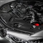 Das Ansaugsystem des F90 M5 Eventuri wurde durch umfangreiche reale Tests und Luftstromsimulationsanalysen entwickelt. Jetzt im aktualisierten V2-Design verfügt es über abgedichtete Filtergehäuse, um auch im Stillstand einen stabileren IAT aufrechtzuerhalten. Die neuen Abdeckungen, die die Gehäuse abdichten, sorgen in Verbindung mit unserer Schaufel- und Schildkombination für einen uneingeschränkten Luftstrom und gleichzeitig für niedrige IATs durch Kaltluftsättigung. Unsere großen vorderen Lufthutzen leiten Umgebungsluft direkt in den Ansaugbereich und sorgen so dafür, dass der Motor nicht unter Hitzeeinwirkung leidet. Darüber hinaus haben unsere goldfarbenen, wärmereflektierenden Schilde integrierte Strömungsführungen, die die Umgebungsluft von den Schaufeln in die Filter leiten. Außerdem ist es uns gelungen, die Querschnittsfläche des Einlassrohrs um über 30 % gegenüber dem Serieneinlass zu vergrößern, da es durch die Öffnungen in den Domstreben führt.