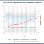 Diese Tests fanden unter relativ kalten Bedingungen mit einer Umgebungstemperatur der Prüfstandszelle von 14 ° C statt, was zeigt, wie ineffizient der Ladeluftkühler ist. In wärmeren Klimazonen wirkt sich der OE-Ladeluftkühler zusammen mit höheren Zulufttemperaturen nachteilig auf den Motor des Suzuki aus, was dazu führt, dass das Steuergerät des Werks das Timing herauszieht, um eine Detonation zu verhindern. was zu einem Stromausfall führt. Bei einem neu zugeordneten Fahrzeug wird dies noch weiter hervorgehoben.